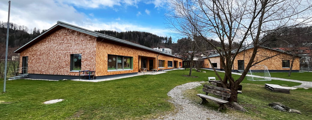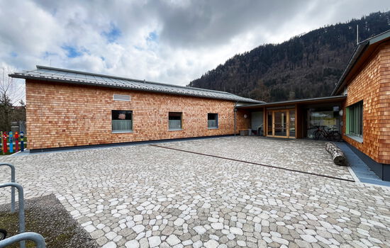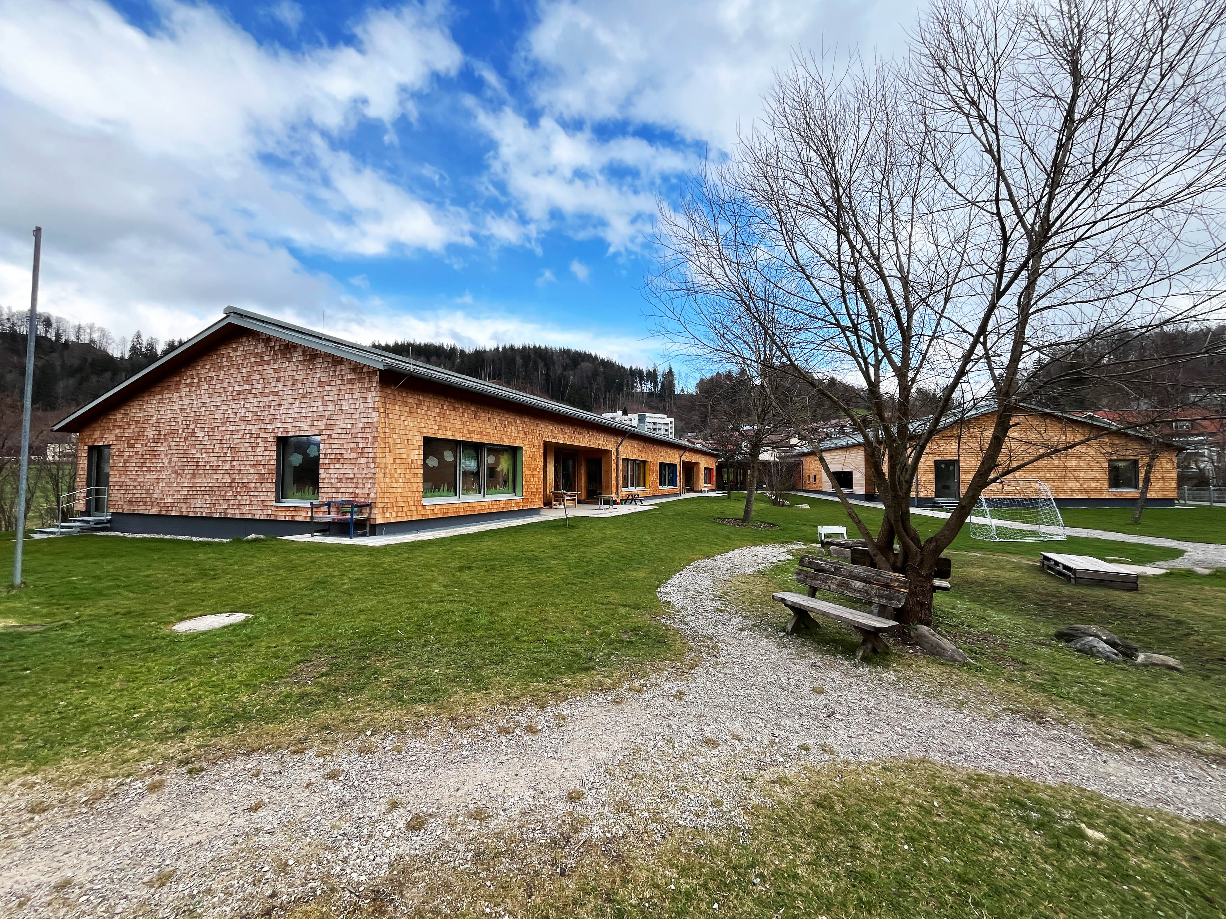 Der Holzbau des Kindergartens und der Kindertagesstätte St. Nikolaus in Immenstadt wies im Sockelbereich, sowie in der Fassade des bestehenden Gebäudes Feuchteschäden auf. Die beschädigten Schwellhölzer der Holzständerkonstruktion wurden im Pilgerschritt erneuert, das Gelände um den Kindergarten im Sockelbereich abgesenkt und eine neue Sockelabdichtung aufgebracht. Anschließend wurde die Fassade des Gebäudes mit einer langlebigen Holzfassade aus naturbelassenen Lärchenschindeln versehen. Die Umsetzung des Vorhabens wurde durch uns in drei Bauabschnitte gegliedert und durch die hervorragende Zusammenarbeit zwischen Handwerkern, Bauleitung und Nutzern konnte die gesamte Sanierung während des laufenden Betriebs durchgeführt werden.